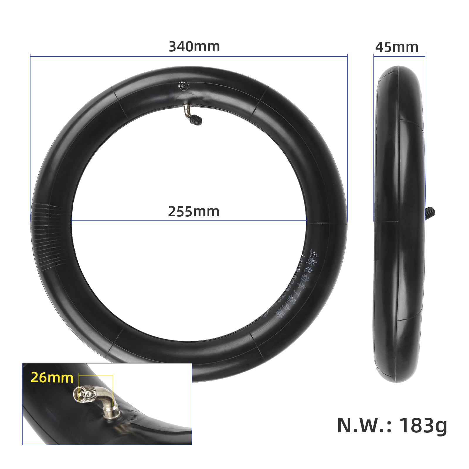 Ventilens 45×45-gradiga böjning förenklar påfyllning av luft, även i trånga utrymmen eller när ventilen sitter svåråtkomligt. Slangen passar både fram- och bakhjul på elscootrar, elcyklar och andra fordon med 14-tums däck.